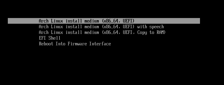 iso 파일 및 usb 등으로 부팅 후 Arch Linux install medium 선택