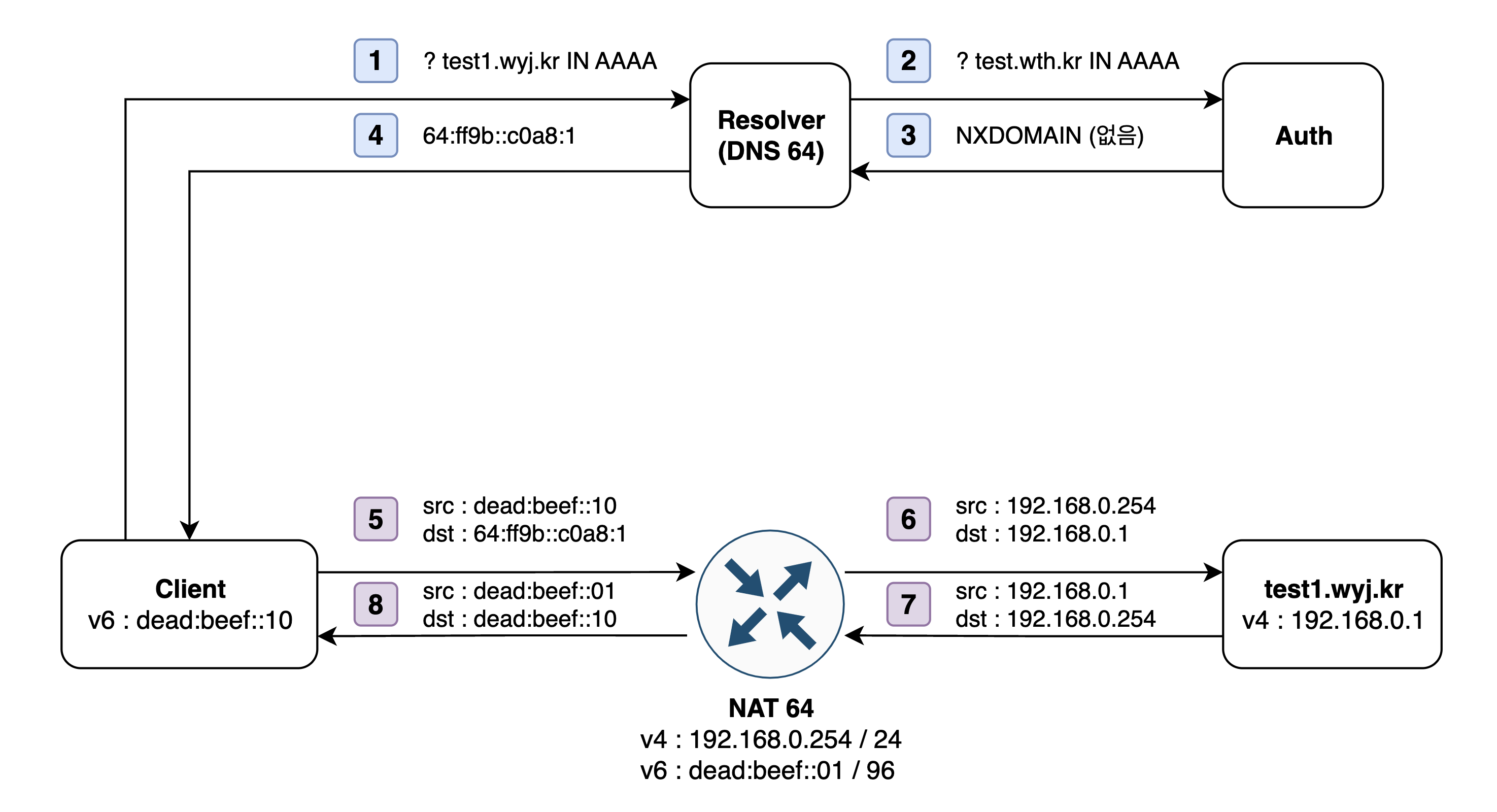 # resolver는 dns64 설정에 의해 다시 test1.wyj.kr에 대한 A레코드를 질의합니다.